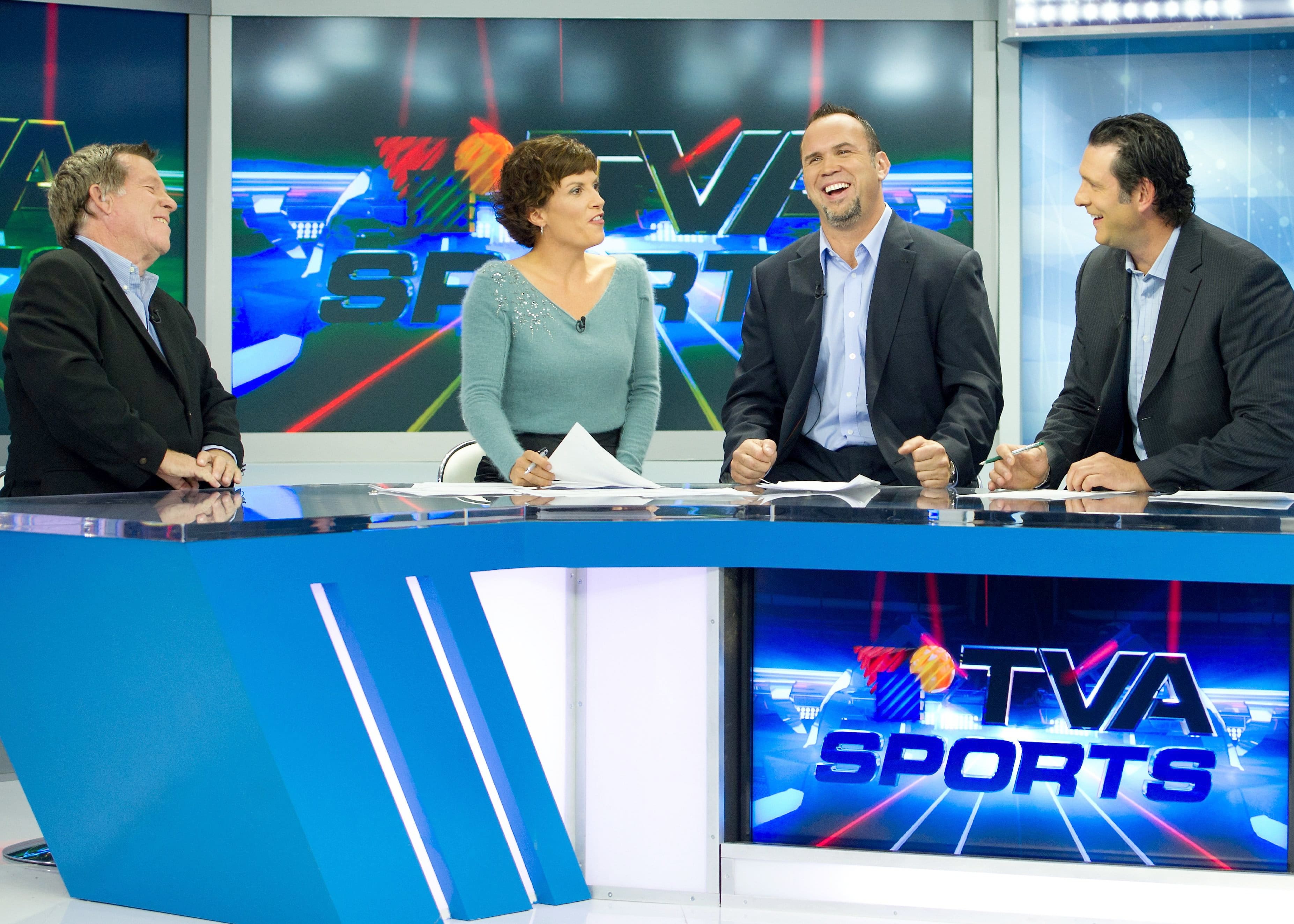 Rodger Brulotte foi um dos primeiros títulos da rede TVA Sports. On le voit ici éclater de rire lors d’une pratique antes do lançamento do réseau télévisé consacré aux sports, em setembro de 2011. Il est aux côtés dos animadores Karine Champagne e Dave Morissette, assim como o analista Enrico Ciccone.