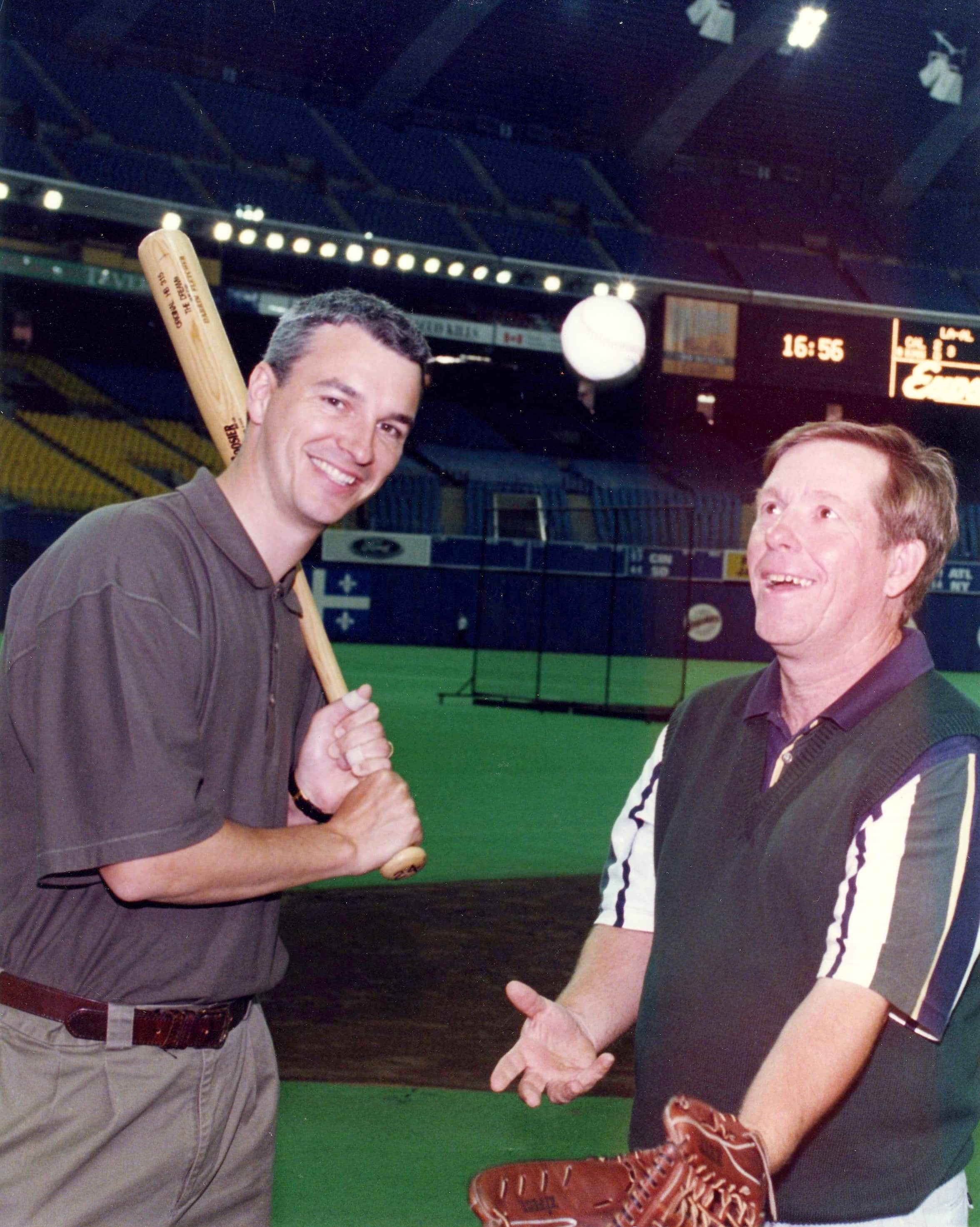 Nesta foto, no voit Rodger e Dan Van Horne, que contém o descritor anglófono das partidas da Expos, no micro antes de uma partida no Stade olympique, na estreia da temporada de 1993.