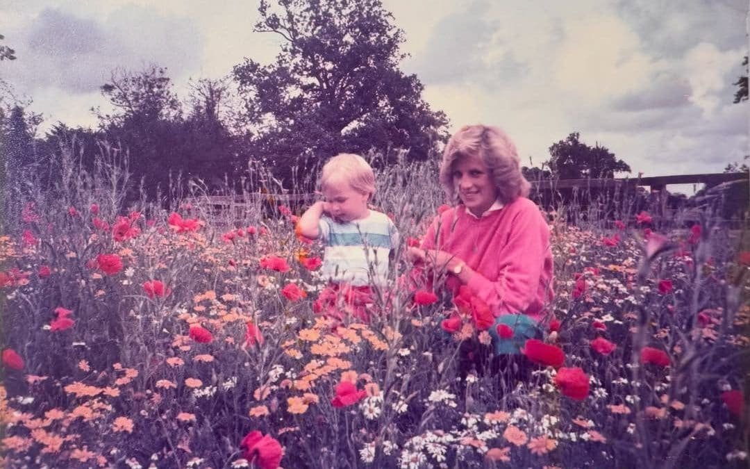 A foto mostra a princesa Diana com o jovem príncipe William em um campo de flores, tirada em Highgrove em 1984.