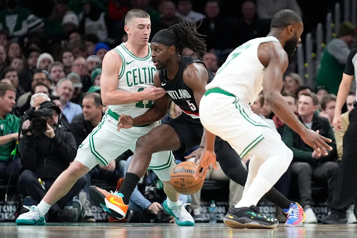 Pritchard acertou uma longa cesta de 3 pontos na campainha do primeiro quarto para dar ao Boston uma vantagem de 32-11. Portland reduziu o déficit para 10 antes que o ex-Blazer Anfernee Simons fizesse um 3 e Pritchard acertasse um chute da pista quando o tempo acabou no intervalo para fazer o 52-37.