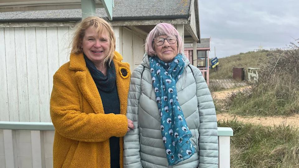 Proprietários de cabanas de praia como Dena Patrick e June Shearman são donos das estruturas de cabanas de praia e alugam do conselho o terreno onde ficam. [Clare Worden/BBC]
