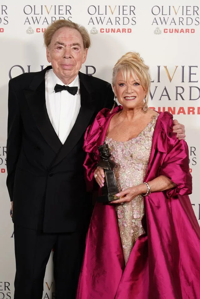 Dame Elaine Paige, à direita, foi presenteada com o prêmio por Lord Andrew Lloyd-Webber, à esquerda, que a chamou de sua ‘amiga mais antiga’ (Ian West/PA)