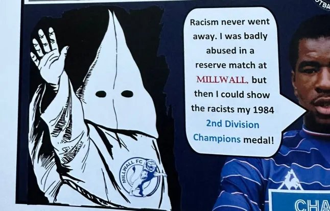 No entanto, a página 20 do livreto mostra uma figura da KKK com o brasão do Millwall em sua roupa branca ao lado de uma imagem de Canoville e um balão de fala que diz: “O racismo nunca foi embora. Fui muito maltratado em uma partida reserva em Millwall, mas então pude mostrar aos racistas minha medalha de campeão da segunda divisão de 1984.’
