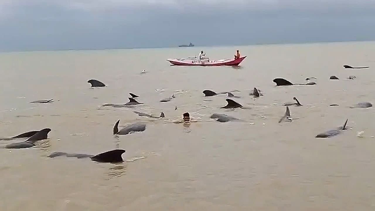 Moradores de East Nusa Tenggara, na Indonésia, encontraram um grupo de pelo menos 50 baleias-piloto encalhadas em águas rasas na praia de Mbadokai. Voluntários ajudaram os golfinhos a regressar ao mar numa operação noturna no dia 9 de março.