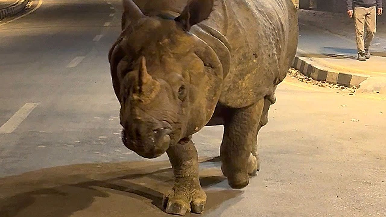 Este é o momento incrível em que um rinoceronte extremamente calmo caminha por uma rua em Chitwan, no Nepal, na noite de 11 de fevereiro.