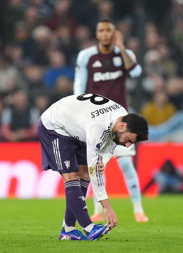 Bruno Fernandes, do Manchester United, se alonga na derrota por 2 a 1 para o Aston Villa (Jacob King/PA).