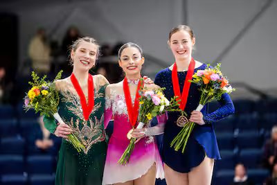 Sara-Maude Dupuis, medalha de prata, Madeline Schizas (ou) e Katherine Medland Spence (bronze) subiram ao pódio, dia 19 de janeiro de 2025, na edição da edição feminina sênior dos Campeões Canadiens de Patinagem Artística Tenus em Laval.