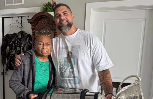 Corey Mace, o técnico do Saskatchewan Roughriders, visitou Angie Reed com a Grey Cup no domingo.