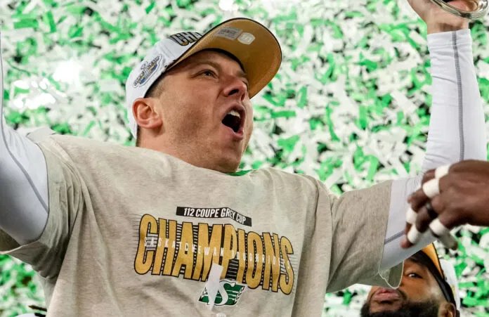 Os Saskatchewan Roughriders terminaram em primeiro lugar na classificação da Divisão Oeste em 2025 com um recorde de 12-6, terminando em primeiro na Divisão Oeste pela primeira vez desde 2019. A equipe derrotou o Montreal Alouettes na 112ª Grey Cup em Winnipeg, marcando o primeiro campeonato da equipe em 12 anos. Trevor Harris foi 11-5 como titular, arremessando 4.549 jardas, 24 touchdowns e 11 interceptações.