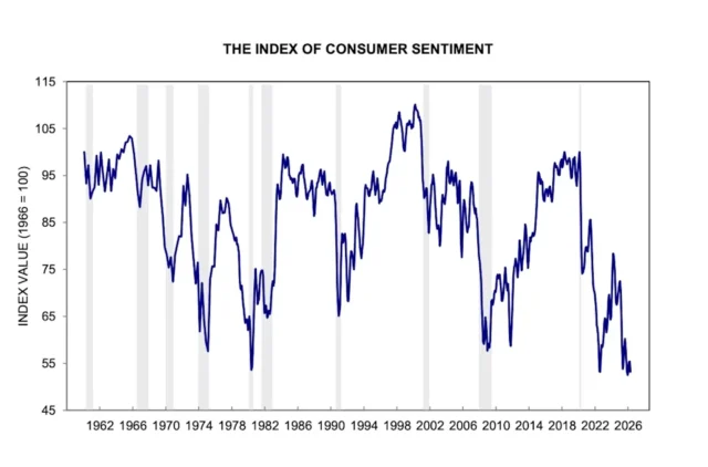 O Índice de sentimento do consumidor mostrou que o sentimento do consumidor encerrou abril com uma leitura final de 49,8, acima da leitura de 48,5 que os economistas esperavam, mas marcando o nível mais baixo já registrado – abaixo das leituras feitas durante a crise financeira, a pandemia de COVID-19 e quando a inflação disparou após a invasão da Ucrânia pela Rússia.