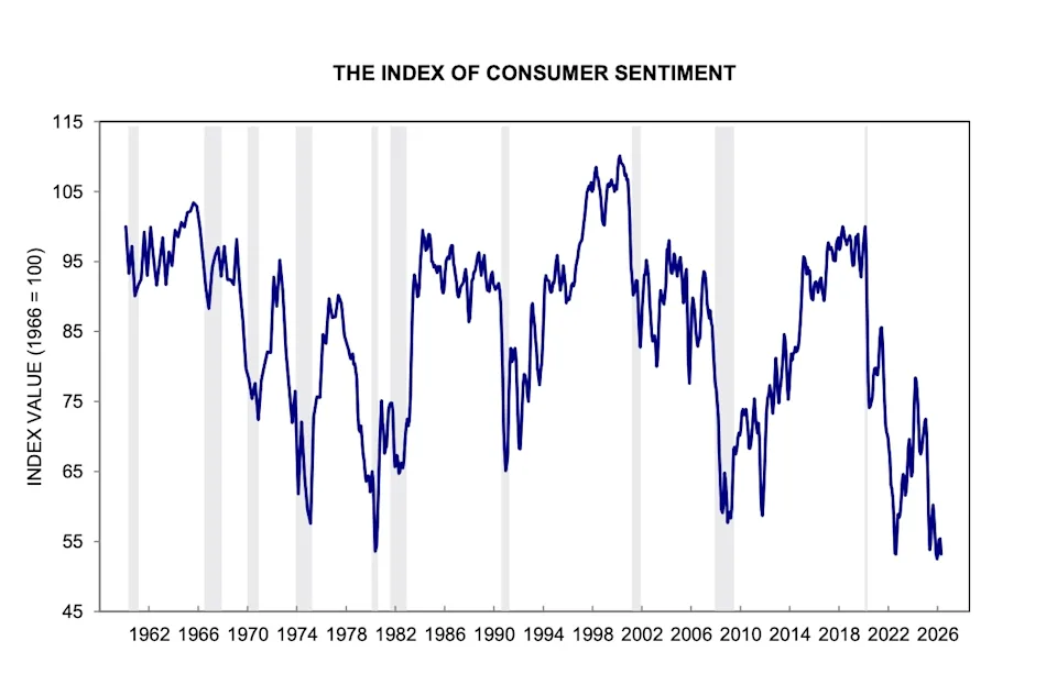 O sentimento do consumidor dos EUA mostrou alguma melhoria no meio de um cessar-fogo de duas semanas entre os EUA e o Irão, mas ainda está em mínimos históricos, de acordo com novos dados da Universidade de Michigan.