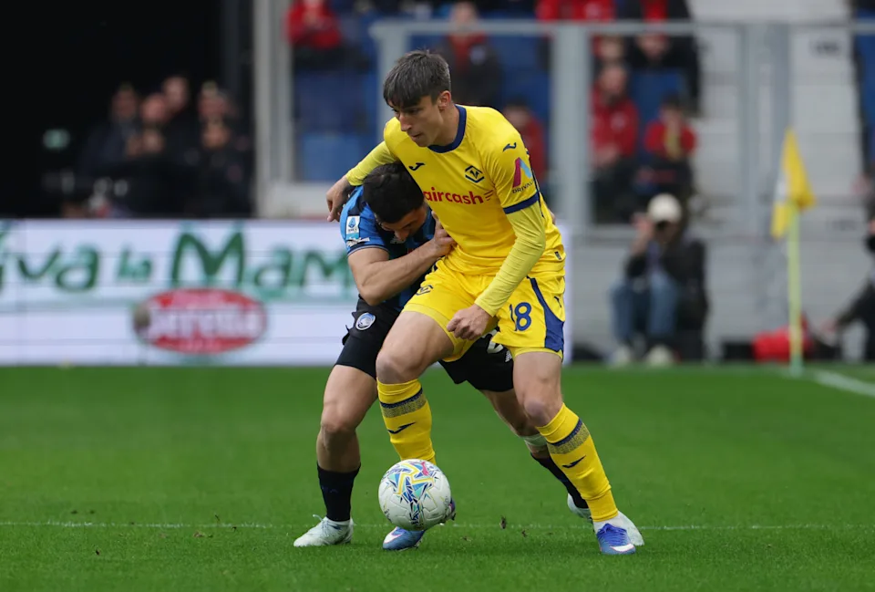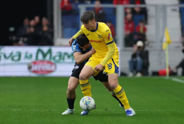 BERGAMO, ITÁLIA – 22 DE MARÇO: Kieron Bowie do Hellas Verona é desafiado por Sead Kolasinac da Atalanta durante a partida da Série A entre Atalanta BC e Hellas Verona FC no Gewiss Stadium em 22 de março de 2026 em Bergamo, Itália. (Foto de Francesco Scaccianoce/Getty Images)