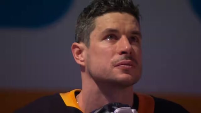 Enquanto um vídeo de homenagem à formação dos Penguins, relatado no Coupe Stanley em 2016, foi divulgado no quadro indicador, Crosby, que considera atentamente, tem os olhos na água.