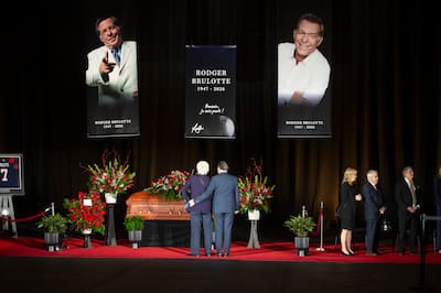 Pascale Vallée, esposa de Rodger Brulotte, aproveitada pela soutien de Michel Bergeron, de Ménick, de Pascale Bourbeau e de Pierre Karl Péladeau, presidente e chef da direção de Quebec, no momento de receber as condoléances. Um fato interessante: Pierre Karl Péladeau foi o fotógrafo oficial do casamento entre Rodger e Pascale em 2010.