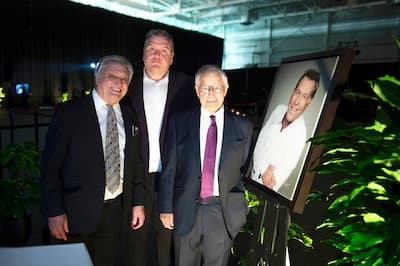Um excelente trio: o barbeiro Ménick, Louis-Philippe Neveu, vice-presidente de operações, informação e esportes do Grupo TVA, e Michel Bergeron. Todos os grandes amigos de Rodger Brulotte.