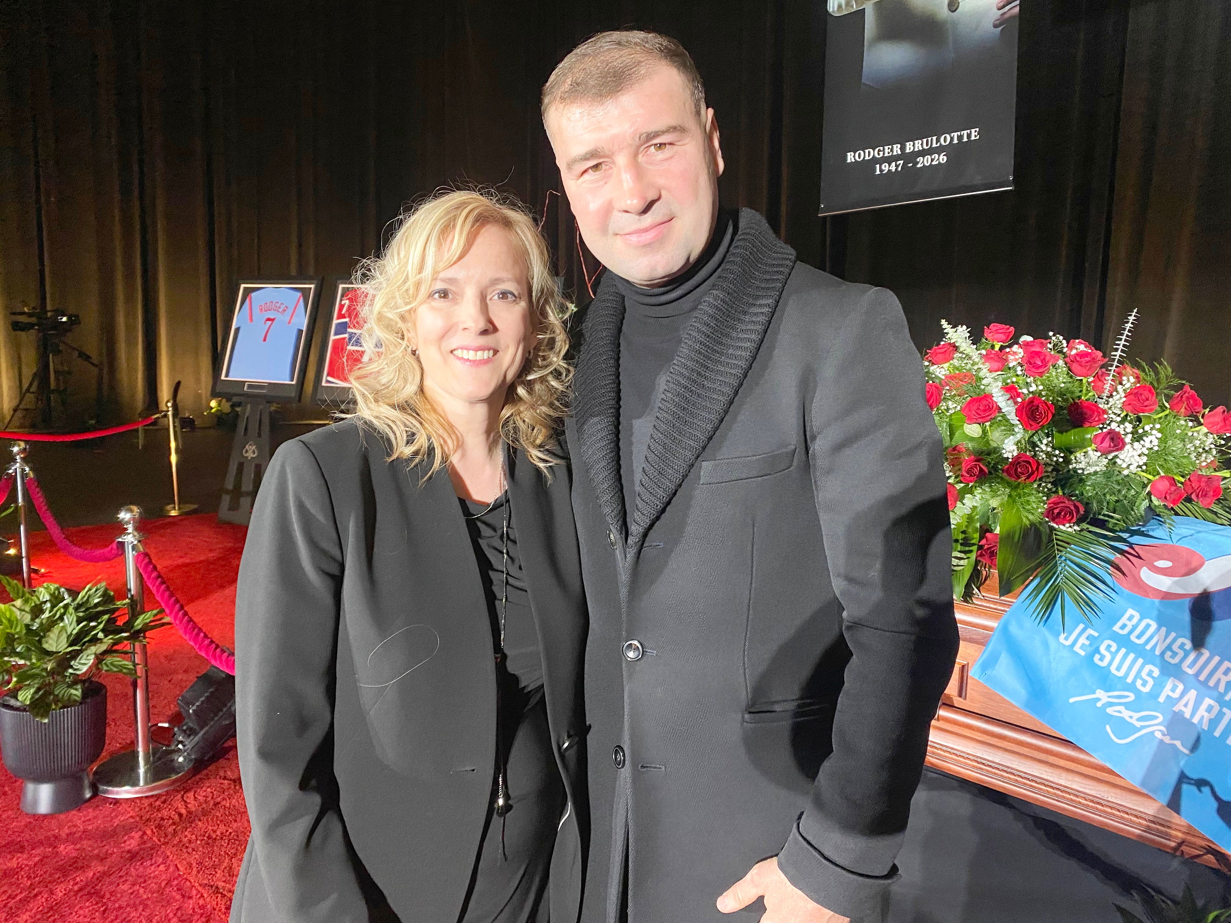Pascale Vallée, esposa de Rodger Brulotte, aproveitada pela soutien de Michel Bergeron, de Ménick, de Pascale Bourbeau e de Pierre Karl Péladeau, presidente e chef da direção de Quebec, no momento de receber as condoléances. Um fato interessante: Pierre Karl Péladeau foi o fotógrafo oficial do casamento entre Rodger e Pascale em 2010.