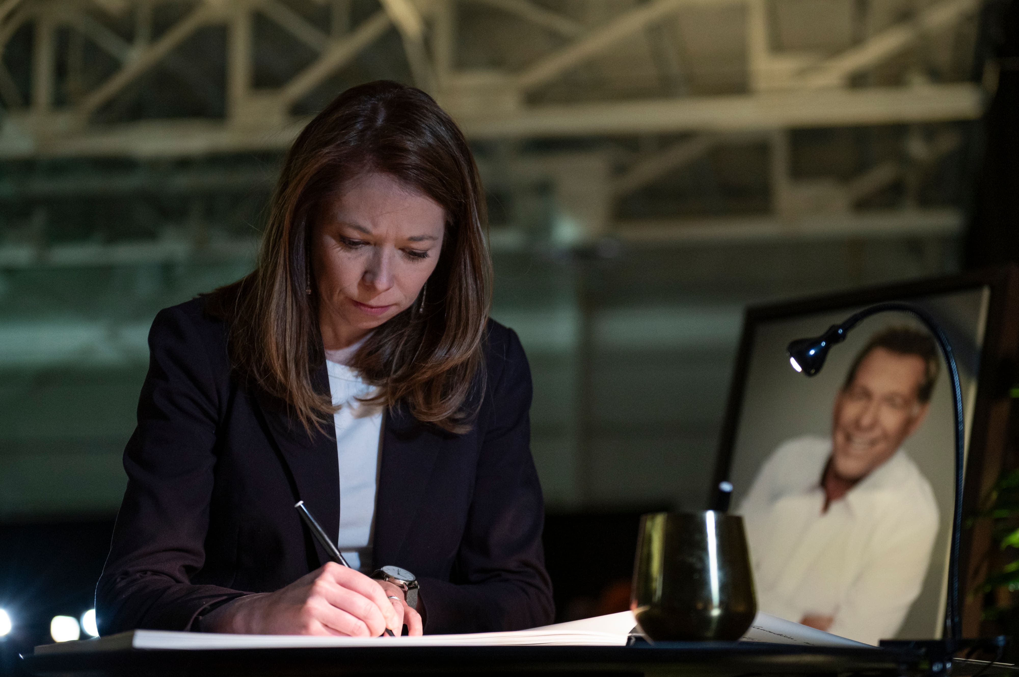 Valérie Tétreault, diretora do Omnium Banque Nationale de Montréal, foi heureuse de receber a capela ardente no estádio IGA. Como bem-vindo, ela escreveu ses boas palavras para Rodger no livro de ouro.