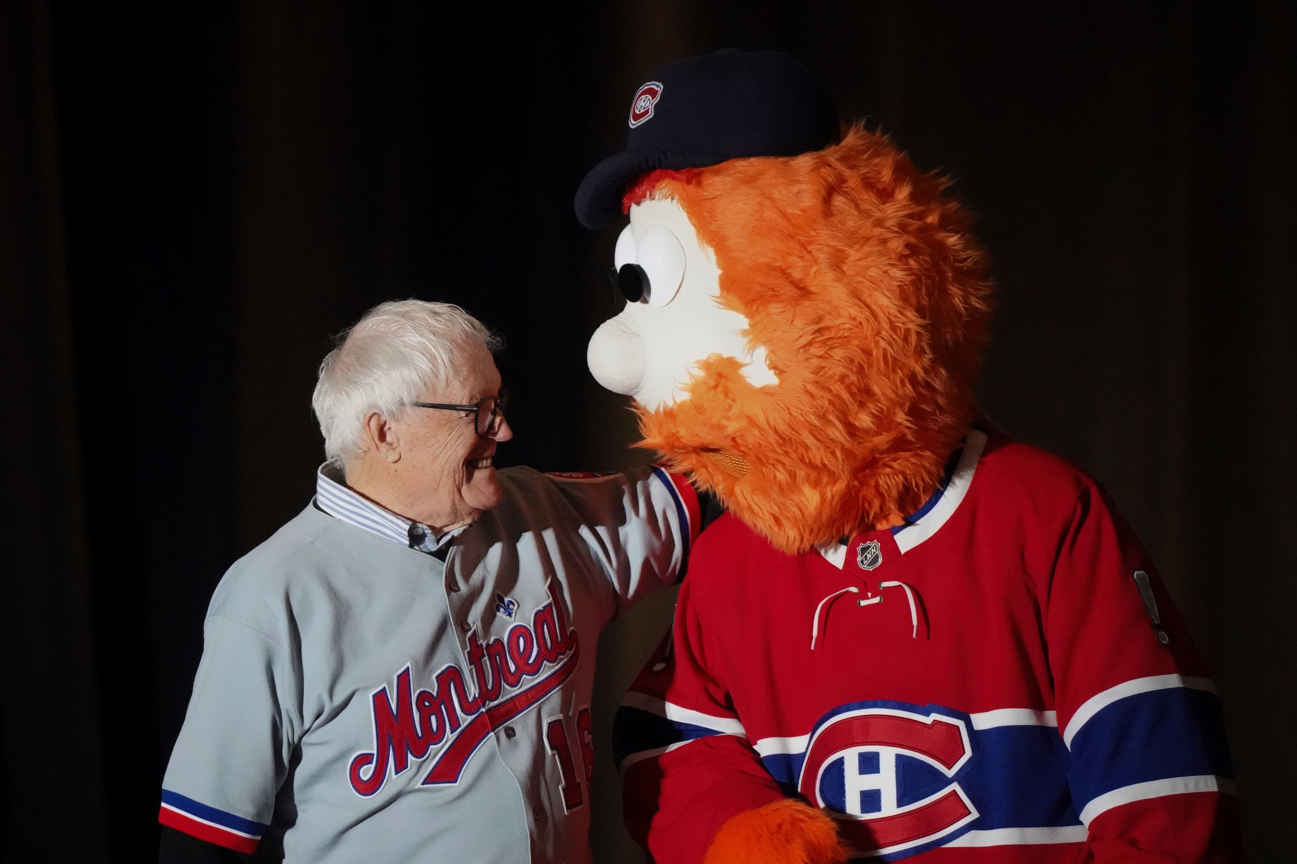 O antigo lanceur Claude Raymond, encore droit como um chêne aos 88 anos, e sempre du plaisir para recuperar o mascote Youppi!, mesmo se ele representasse o canadense desormais de Montreal.