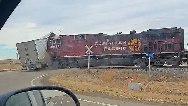 Este é o momento em que um trem bate no trailer de um caminhão em uma passagem de nível em Alberta, Canadá, em 17 de março. Relatos dizem que o caminhão parou no cruzamento e tentou atravessar enquanto o trem se aproximava, antes de parar novamente. O motorista do caminhão foi multado por dirigir descuidado.