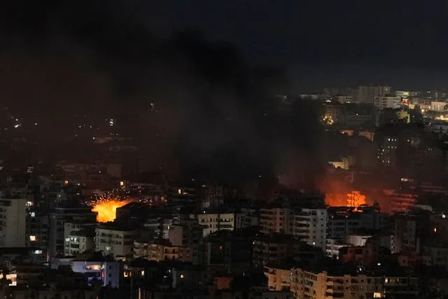 Chamas e fumaça sobem do local dos ataques aéreos israelenses em Dahiyeh, subúrbio ao sul de Beirute (Hassan Ammar/AP)