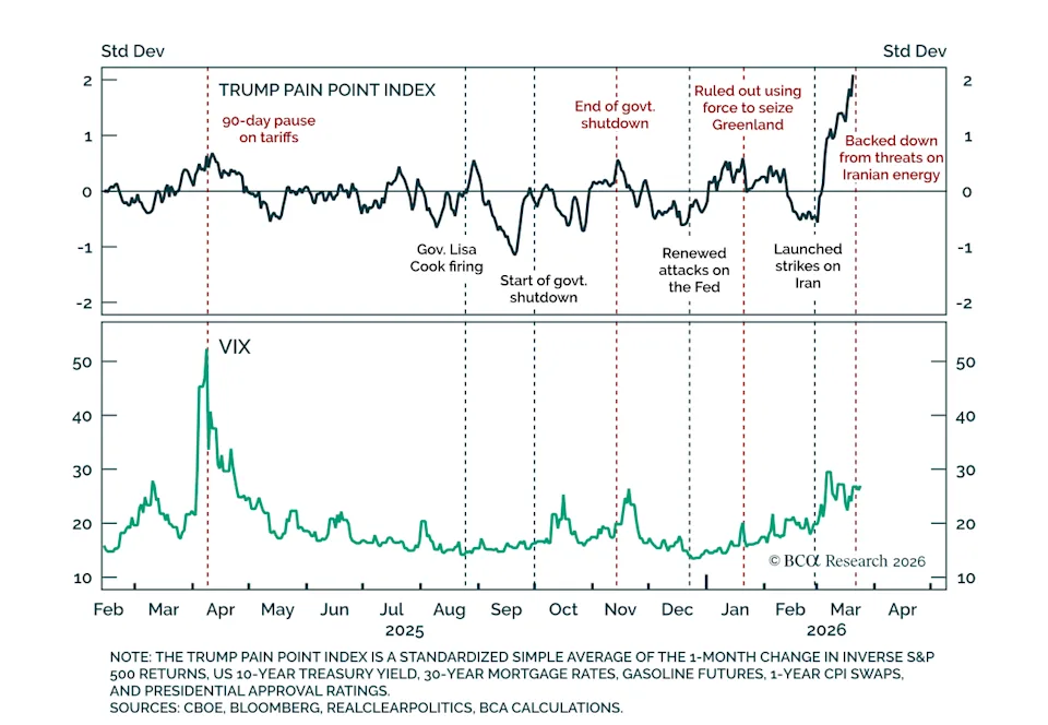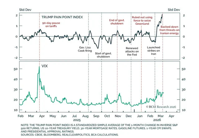 O padrão TACO é tão familiar que os analistas conceberam ferramentas como a BCA Research “Índice de pontos problemáticos de Trump” para antecipar quando uma mudança de política poderá ocorrer.
