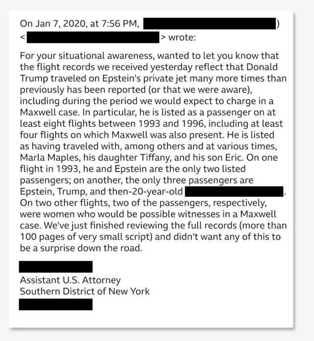 O e-mail afirma que Trump “está listado como passageiro em pelo menos oito voos entre 1993 e 1996, incluindo pelo menos quatro voos nos quais [Epstein’s associate Ghislaine] Maxwell também esteve presente. Ele está listado como tendo viajado com, entre outros e em vários momentos, Marla Maples, sua filha Tiffany e seu filho Eric.”