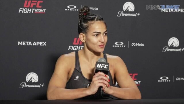 A vencedora do UFC Fight Night 269, Bia Mesquita, conversa com o MMA Junkie e outros repórteres após a finalização no primeiro round sobre Montse Rendon, em Las Vegas.