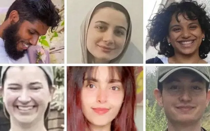 Seis manifestantes da Ação Palestina estão em greve de fome. Da esquerda para a direita: Kamran Ahmed, Teuta Hoxha, Qesser Zuhrah, Amy Gardiner-Gibson, Heba Muraisi e Jon Cink