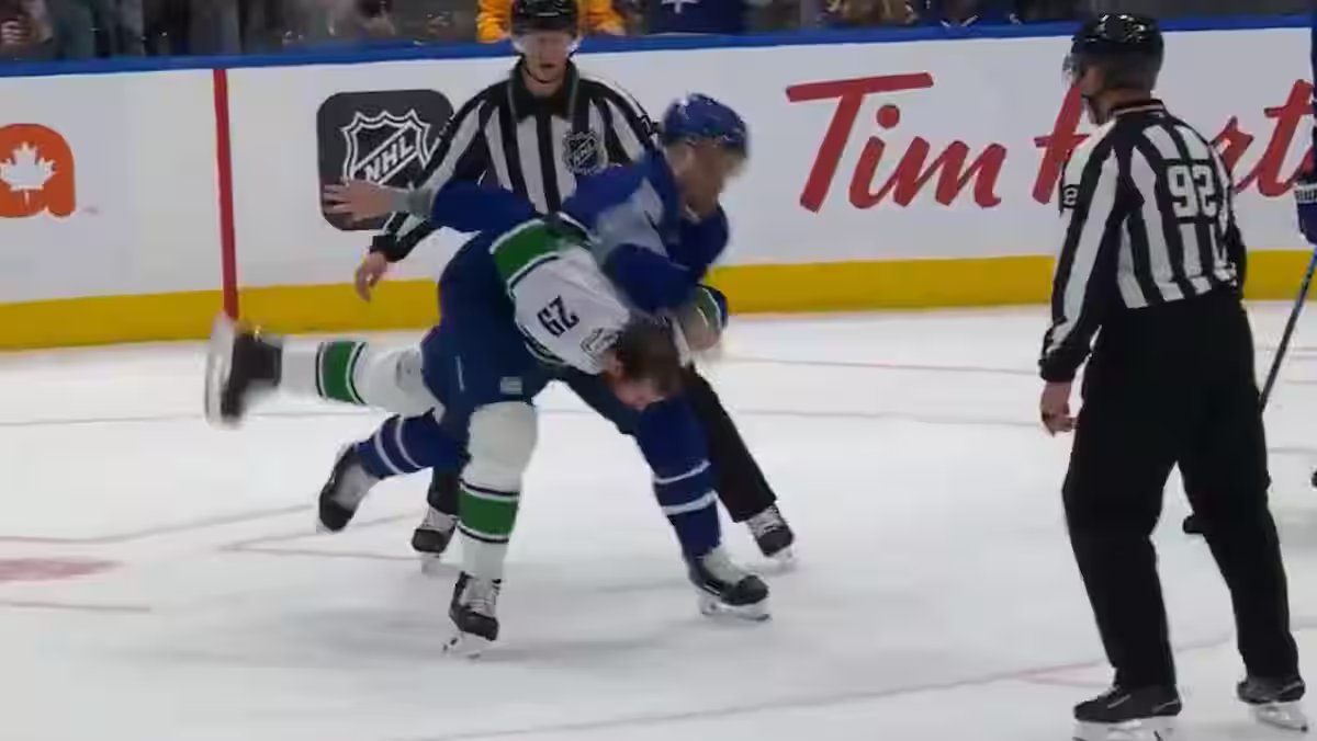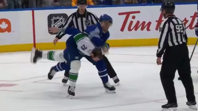 No segundo período, os Maple Leafs de Toronto enfrentaram 4 a 0 contra Canucks de Vancouver e esses últimos tentaram provocar aquele que escolheu. Pettersson, um defensor de 6pi5po, pensa em ser fácil com Domi.