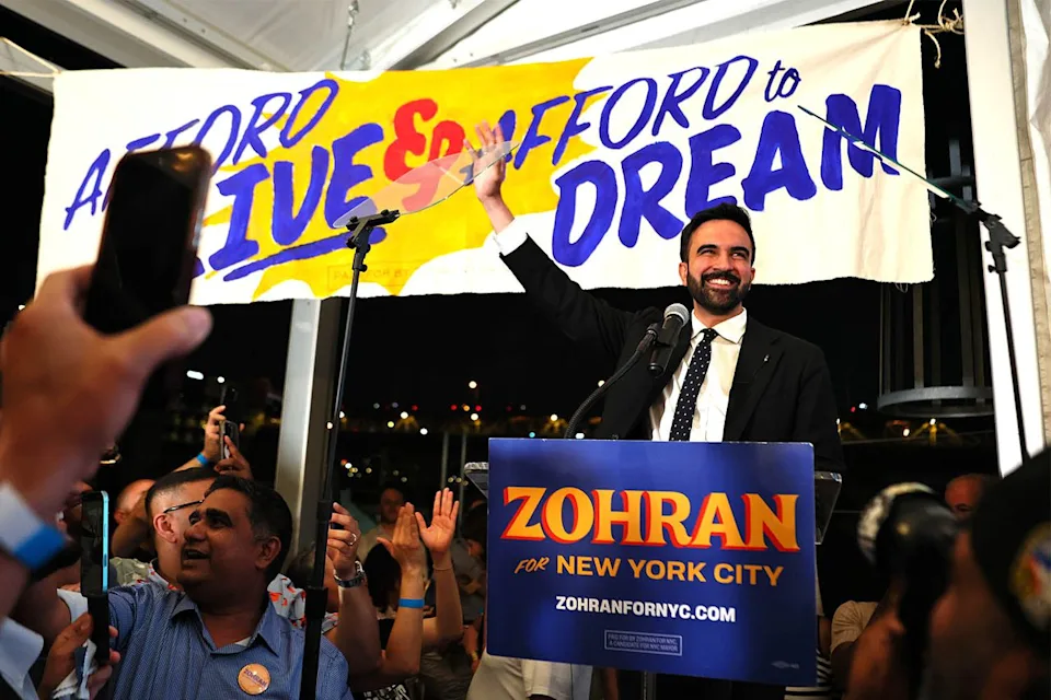 Zohran Mamdani cumprimenta apoiadores durante uma festa noturna das eleições primárias no Queens em 24 de junho de 2025