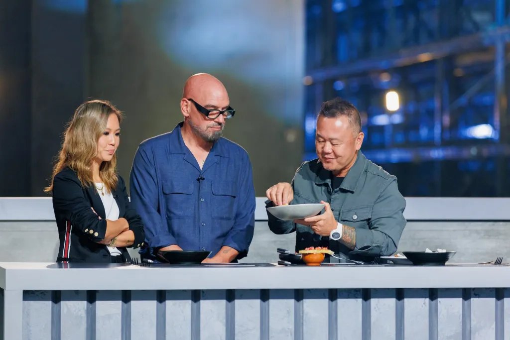 Os apresentadores Michael Symon e Esther Choi observam o Juiz Jet Tila degustando o prato da primeira rodada do Concorrente Alex Stupak, Perna de Sapo em Masa, Tempura com Molho Tártaro Mexicano, como visto em 24 de 24: Last Chef Standing, Temporada 3.