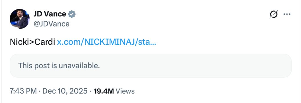 Minaj tem usado a hashtag “#FreeChristians” para afirmar que os cristãos estão a ser sistematicamente assassinados na Nigéria, uma causa que tem sido amplamente defendida pela direita. Ela e o vice-presidente JD Vance formaram um fã-clube mútuo sobre o assunto, com Vance twittando na semana passada, “Nicki> Cardi”, argumentando por sua superioridade sobre uma colega rapper que se manifestou contra a administração Trump.