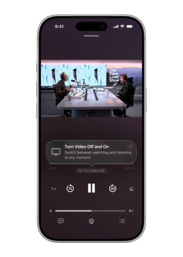 No app Apple Podcasts, para programas com vídeo, os usuários poderão alternar entre assistir e ouvir programas. Você poderá assistir a vídeos de dentro do aplicativo e passar para a exibição horizontal completa, bem como baixar vídeos para assistir offline. Os episódios de vídeo serão integrados aos recursos existentes do Apple Podcasts, incluindo recomendações personalizadas e curadoria editorial na guia “Novo” e nas páginas de categoria.