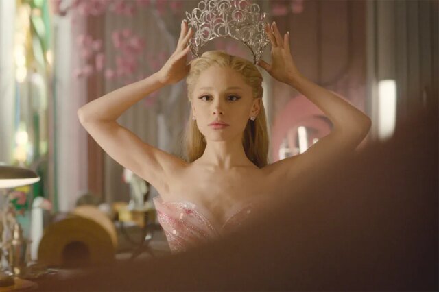 Grande continua dizendo: “Já passei por isso e tenho essas bolsas nos olhos… Lembro-me de que foi uma decisão que Frances e eu tomamos juntos. Queríamos que parecesse real e verdadeiro”. O figurinista Paul Tazewell (que ganhou o prêmio Costume Designers Guild pelos dois filmes “Wicked”) também seguiu o arco de Glinda em seu trabalho. “Quando somos apresentados à personagem dela, vemos que ela realmente mergulhou totalmente no mundo do Feiticeiro. É uma princesa em uma torre, e ela está usando roupas que são fiéis a isso”, diz ele. “Sua escolha de roupas dá essa ideia de pessoa privilegiada e com muito estilo.”