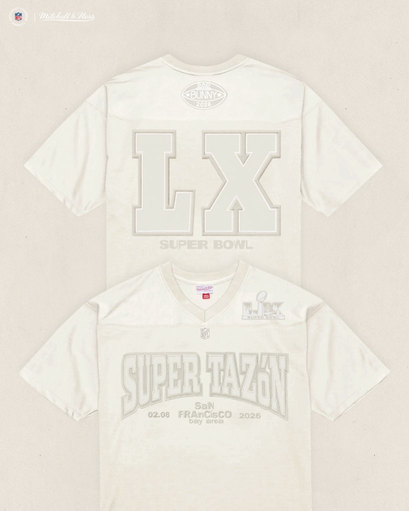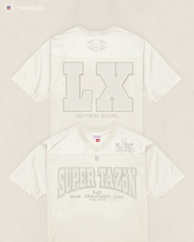 A frente da camisa branca creme diz “Super Tazon” (a tradução espanhola para Super Bowl), com LX Super Bowl impresso nas costas, sob o logotipo do futebol Bad Bunny. A marca de roupas esportivas lançará a camisa em quantidades limitadas, que já estão disponíveis para pré-encomenda no site da Mitchell & Ness. O produto será lançado oficialmente em 1º de maio.