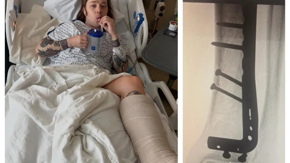 O músico neo-bluegrass acessou as redes sociais na segunda-feira para postar fotos suas deitado em uma cama de hospital, junto com vários raios X das porcas e parafusos que agora mantêm sua perna unida. Ele se desculpou por precisar adiar o resto de seus shows de abril, explicando que planejava seguir em frente enquanto se apresentava sentado, antes de perceber que o plano era impraticável, dada a gravidade de seu ferimento.