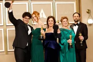 Diane Becker (centro) com outros vencedores do Oscar de ‘Navalny’ (LR) Daniel Roher, Odessa Rae, Melanie Miller e Shane Boris em 12 de março de 2023 em Hollywood, Califórnia.