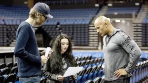 A partir da esquerda: Stephen Merchant, Florence Pugh e Dwayne Johnson no set de ‘Fighting with My Family’ de 2019