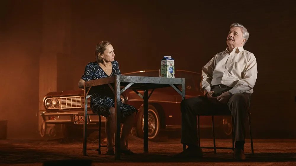 Há momentos, na grande e modesta produção do diretor Joe Mantello, ambientada em uma espécie de garagem purgatorial, em que a personalidade inata do engraçadinho de Lane lança sombras ressonantes. (O cenário é de Chloe Lamford, a iluminação dos faróis através do escapamento do carro é de Jack Knowles.) Willy lamenta para sua robusta e ingrata esposa, Linda (Laurie Metcalf, mantendo sua reputação como MVP da Broadway), que os compradores na estrada riem dele – aquele até o chamou de camarão.