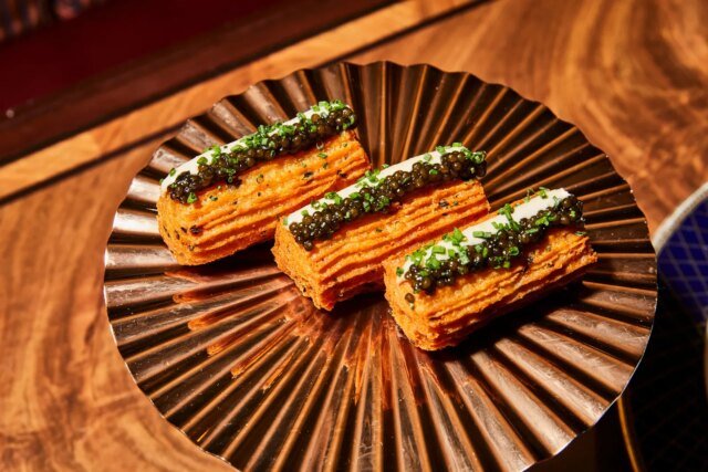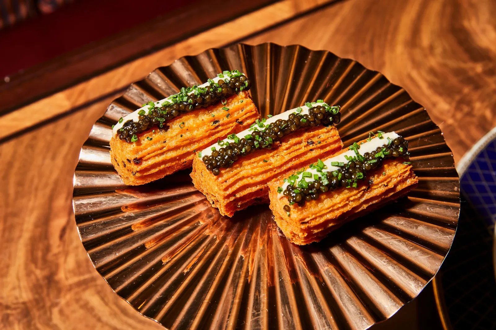 A porta, aqui, é verde e pesada, com uma grade de ferro forjado sobre um olho mágico central, e está aqui há séculos. O prédio é a antiga casa do infame bar clandestino Chumley’se seu endereço, 86 Bedford Street, é considerado a origem de “oitenta e seis”, gíria da era da Lei Seca para “se perder”. Assim como o 4 Charles Prime Rib, outro mastro megaluxuoso bem guardado no West Village, com o qual faz comparações inevitáveis, o Eighty-Six é uma churrascaria muito boa. A equipe do Catch refez inteiramente o espaço em tons ricos e pesados - madeiras escuras, espelhos bronzeados, veludos de cobre. Uma mesa de dois tampos, enfiada em uma alcova perto da lareira (em funcionamento), era supostamente a mesa favorita de F. Scott Fitzgerald. Você poderia, como ele presumivelmente fez, obter uma mancha completa – um Martini defumado com macieira, servido teatralmente ao lado da mesa sobre uma estalagmite de gelo cultivado, estilo feira de ciências, de água hiper-gelada, é excelente e potente como o inferno – mas, nas linhas de visão de tantos iPhones de clientes filmando tanto conteúdo vertical falso, pode ser imprudente.