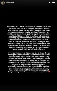 “Estou muito animada para voltar aos palcos este ano e visitar vocês em tantas cidades quanto puder”, Lovato começou seu post, dirigido aos seus fãs, os Lovatics. “Ao começar a me preparar para a turnê, percebi que estendi demais o que poderia ser possível.”
