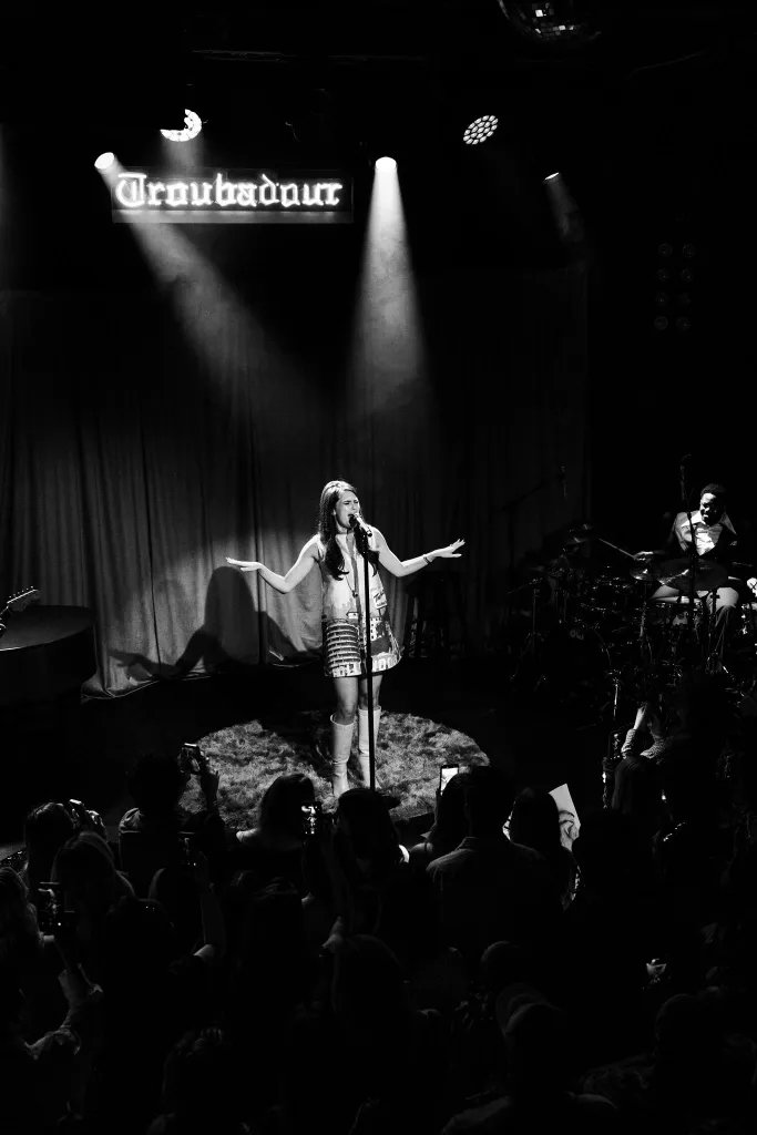 Uma grande dúvida que alguns podem ter é: ela só faz baladas? E se sim, isso seria um problema, ou estaríamos bem com um cantor completamente sem banger como superstar? Há pouco mais de um ano, ela lançou seu primeiro EP, “Sink Now, Swim Later”, que era longo o suficiente, com oito faixas, para que você pudesse suspeitar que foi impedido de se tornar um álbum de verdade apenas porque ela queria mantê-lo mais restrito no momento do que planejou. Esse EP, e alguns números únicos que o precederam ou seguiram, aderiram em grande parte a uma estética apenas de vocal e piano. Então foi quase uma surpresa ver uma bateria no palco antes de sua entrada no Troubadour. Quando a música começou, com apenas dois membros da banda a reboque (e algumas faixas de apoio ocasionais), aquela baterista usava principalmente marretas e se concentrava mais nos sotaques do que nas batidas, para manter as coisas no modo silencioso pelo qual ela é conhecida. Era um lugar lindo para ficar, para quem não era viciado em bop.