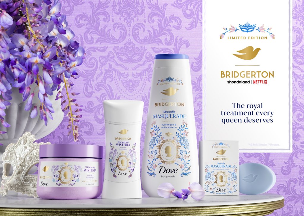 A coleção Dove x Bridgerton inclui sabonete líquido, esfoliante corporal, névoa corporal, sabonete líquido para as mãos, desodorante antitranspirante e barras de beleza, todos apresentando as fórmulas hidratantes familiares de Dove. As quatro fragrâncias remetem diretamente às histórias românticas e cenários do show: Moonlit Masquerade combina hortênsia, eucalipto e almíscar quente; Whispering Wisteria combina orquídea, champanhe e florais aquosos; Raspberry Rendezvous se transforma em uma divertida mistura gourmand de framboesa, rosa e chantilly; e Love & Meadows combina bergamota, flores silvestres e rosa com âmbar e cedro, inspirado na tão esperada conexão de Sophie e Benedict.