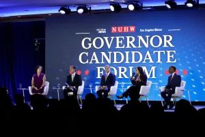 (LR) A ex-congressista Katie Porter, o ex-prefeito de Los Angeles Antonio Villaraigosa, o ex-secretário de Saúde dos Estados Unidos Xavier Bacerra, a ex-controladora estadual Betty Yee e o superintendente de instrução pública da Califórnia Tony Thurmond sentam-se no palco do Fórum de Candidatos a Governador da NUHW em 28 de setembro de 2025 em Los Angeles, CA. (Foto: Getty)