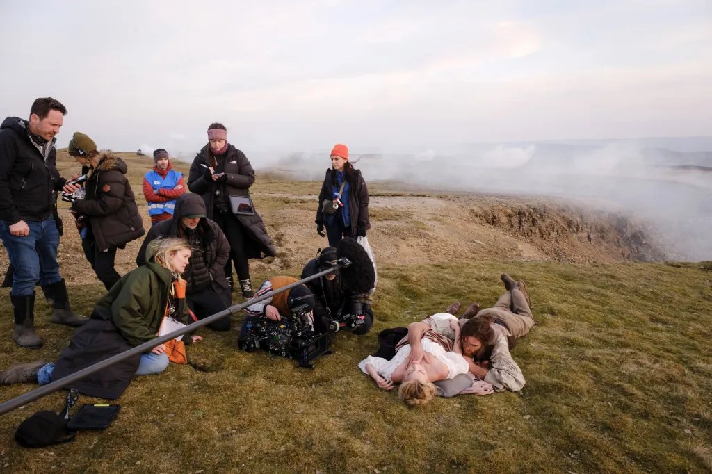 A diretora Emerald Fennell e o diretor de fotografia Linus Sandgren filmam uma cena de “O Morro dos Ventos Uivantes” com Margot Robbie e Jacob Elordi.