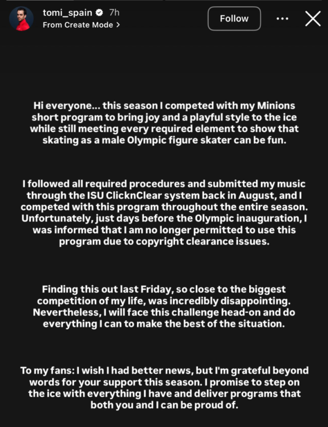 “Nesta temporada competi com minha rotina de ‘Minions’ para trazer alegria e um estilo divertido ao gelo, ao mesmo tempo em que cumpri todos os elementos obrigatórios e demonstrei que patinar no gelo como patinador artístico olímpico masculino também pode ser divertido”, escreveu ele em uma longa declaração em suas histórias no Instagram. Sabate observou que “seguiu todos os procedimentos exigidos e enviou minha música através da ISU [International Skating Union] Sistema ClicknClear em agosto” e “competiu com este programa durante toda a temporada”.