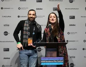 (LR) Abd Alkader Habak e Janay Boulos, vencedores do Prêmio Especial do Júri de Documentário Mundial de Cinema por Impacto Jornalístico por ‘Birds of War’, na Cerimônia de Premiação do Festival de Cinema de Sundance de 2026 em 30 de janeiro de 2026 em Park City, Utah.