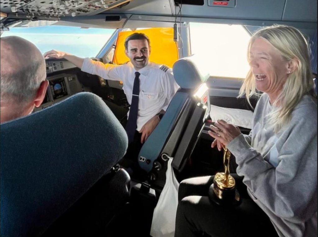 A piloto do avião de Helle Faber posa alegremente com sua estatueta do Oscar ao chegar a Copenhague, cortesia de Helle Faber