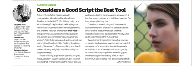 Em 2013, o trabalho de Autumn Durald Arkapaw em “Palo Alto” de Gia Coppola lhe rendeu elogios e uma vaga em Variedade Lista de 10 cineastas para assistir de 2014.