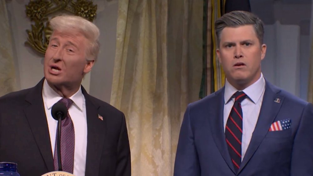 Trump, de James Austin Johnson, abriu o segmento em um pódio com o selo presidencial falando sobre o feriado de Natal.